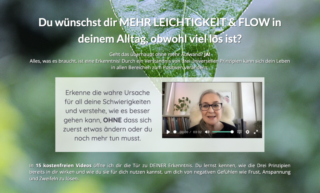 In 15 kostenfreien Videos öffne ich dir die Tür zu DEINER Erkenntnis. Du lernst kennen, wie die Drei Prinzipien bereits in dir wirken und wie du sie für dich nutzen kannst, um dich von negativen Gefühlen wie Frust, Anspannung und Zweifeln zu lösen.